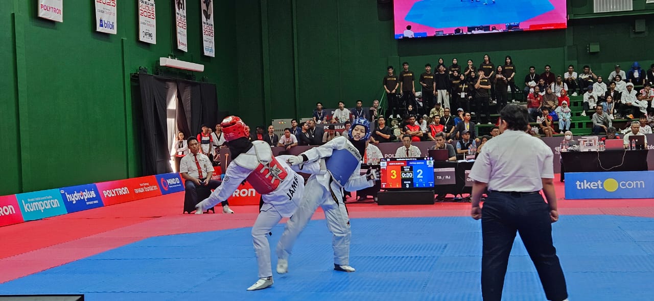 Dua atlet taekwondo berlaga sengit pada pertandingan PON Bela Diri 2025 di GOR Djarum, Kudus, Jawa Tengah. Kontingen Jambi menurunkan 16 atlet dari empat cabang olahraga bela diri dengan target menambah perolehan medali. (Dok. Koni Jambi)