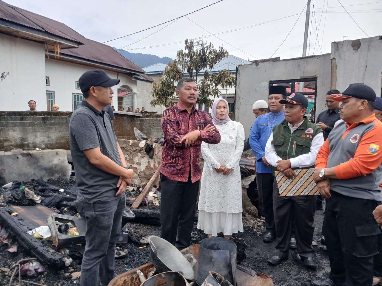 Bupati Kerinci Monadi, didampingi Ketua TP-PKK Novra Wenti Monadi dan Tim BPBD, meninjau lokasi kebakaran di Desa Pendung Hilir, Kecamatan Air Hangat, Senin (6/10/2025). (Dok. Deko)