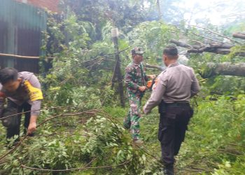 JT.COM - Sebuah pohon mahoni berukuran besar tumbang dan menimpa...