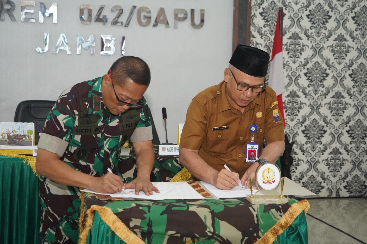 JT.COM – Dalam upaya mempercepat realisasi program ketahanan pangan nasional, Komando Resor Militer (Korem) 042/Gapu bersama Dinas Tanaman Pangan, Hortikultura, dan Peternakan (DTPHP) Provinsi Jambi menandatangani Nota Kesepahaman (MoU) di Aula Makorem 042/Gapu, Senin (2/6/2025).