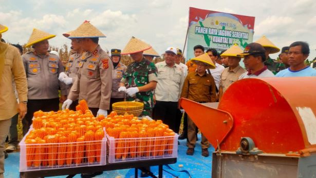 Bupati Tanjung Jabung Timur bersama jajaran pemerintah daerah, aparat kepolisian, TNI, dan perwakilan SKK Migas–PetroChina International Jabung Ltd menghadiri panen raya jagung serentak kuartal III tahun 2025 di Tanjabtim, Jambi, Sabtu (27/9/2025). (Dok. Nahar)