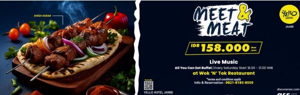 “Melalui ‘Meet & Meat’, kami ingin memberikan pengalaman bersantap yang berbeda. Tidak hanya soal rasa, tapi juga suasana yang nyaman dengan hiburan musik langsung, cocok untuk keluarga, teman, maupun rekan kerja,” tulis pihak YELLO Hotel Jambi pada siaran pers yang diterima media ini.